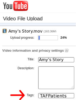 • Simply upload your video to YouTube, and in the Tag area (as shown below) add the tag "TAFPatients" so that we can identify your video.